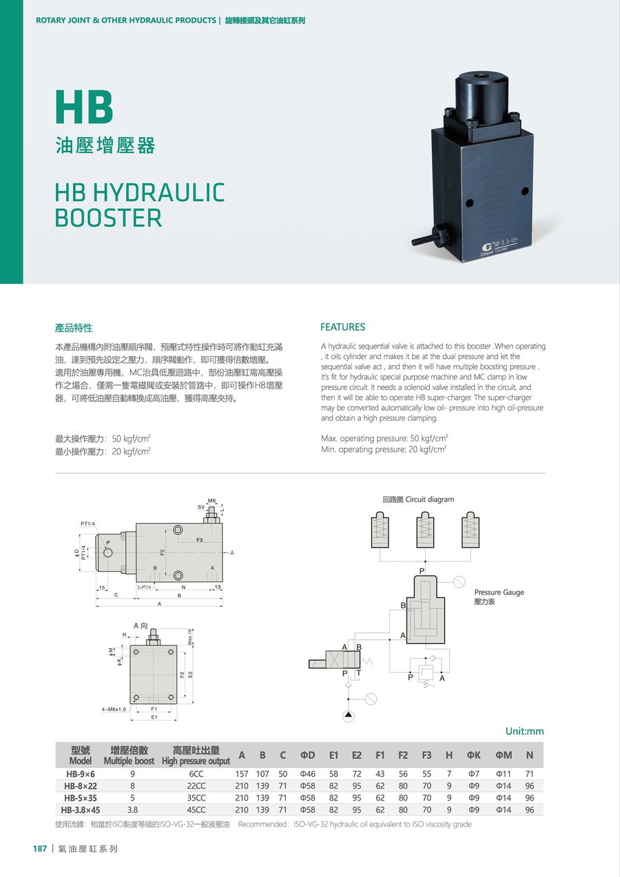 boosting pressure. It's fit for hydraulic special purpose machine and MC clamp in low pressure circuit. It needs a solenoid valve installed in the circuit, and then it will be able to operate HB super-charger. The super-charger may be converted automatically low oil- pressure into high oil-pressure and obtain a high pressure clamping.